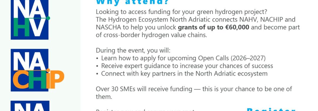 NASCHA (North Adriatic Smart Communities Hydrogen Accelerator): Will present its cascade funding opportunities, highlighting the upcoming Open Call offering direct grants of up to €60,000 per project.